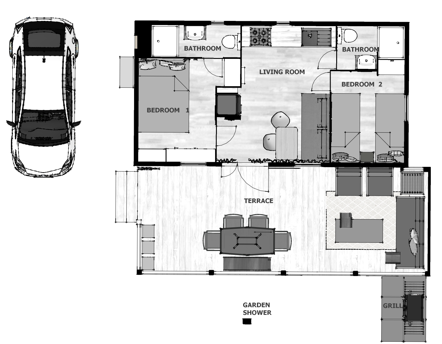 Explore the layout of our mobile home – a thoughtfully designed space for up to 6 guests. It features two separate bedrooms, two bathrooms, a cozy living room with a kitchen, and a spacious terrace perfect for breakfast or evening relaxation. Fully equipped with air conditioning, Wi‑Fi, a complete kitchen, and plenty of storage space.